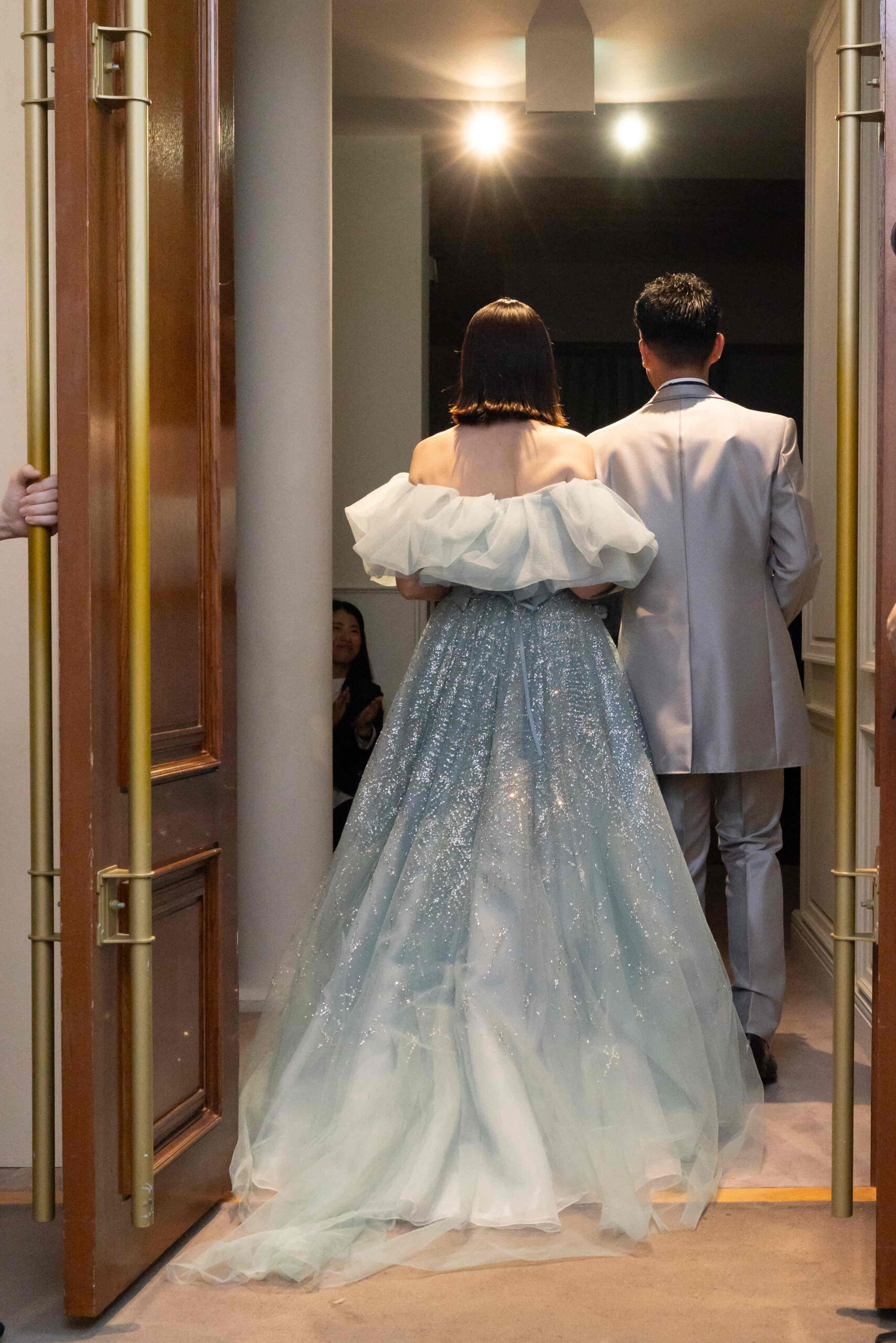 光輝くグリッタードレスにワッシャーオーガンをランダムにたくしあげたボリュームショルダーで、