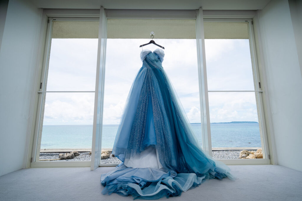 多色のチュールをグラデーションに使用し、照明によりどの角度から見てもさまざまな表情を見せてくれるドレスです。