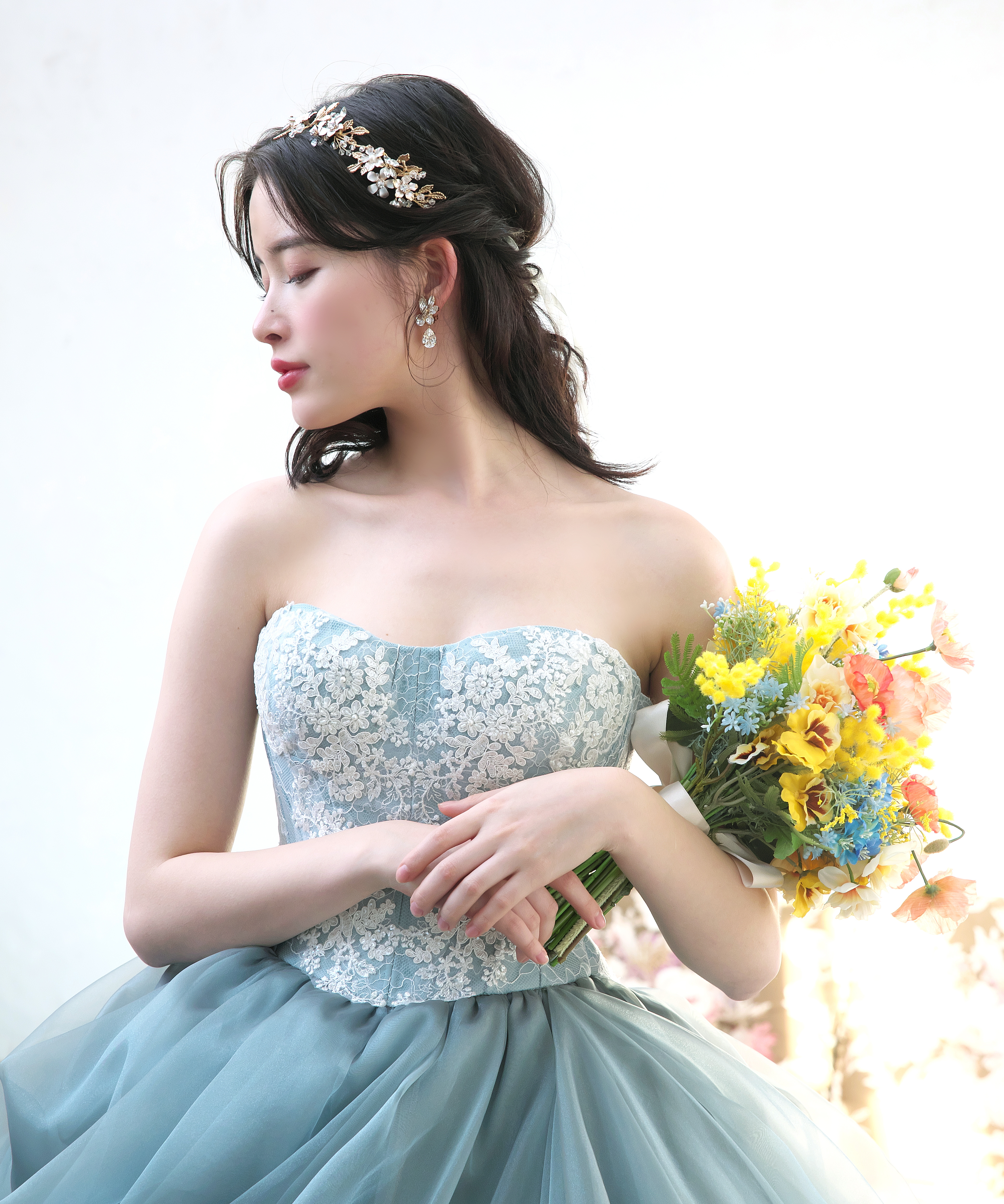 KIYOKO HATA(キヨコハタ) KH-0471 柔らかな色味が優しい印象を醸し出してくれる美しいドレス。胸元のお花は取り外し可能なので2WAYでお召しいただけます。