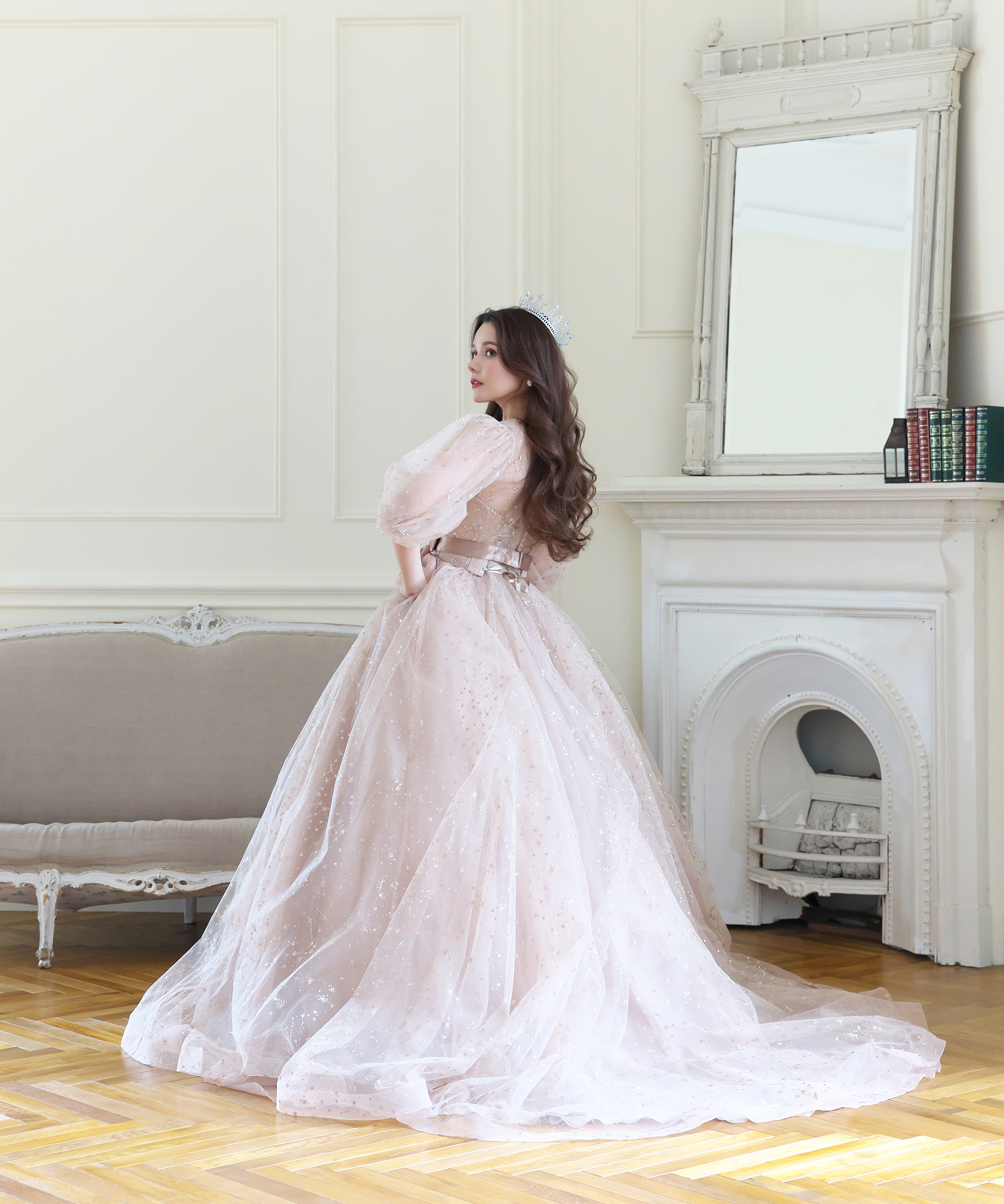 夜空に煌めく星座をグリッターチュールの模様に起こしてドレスの上に