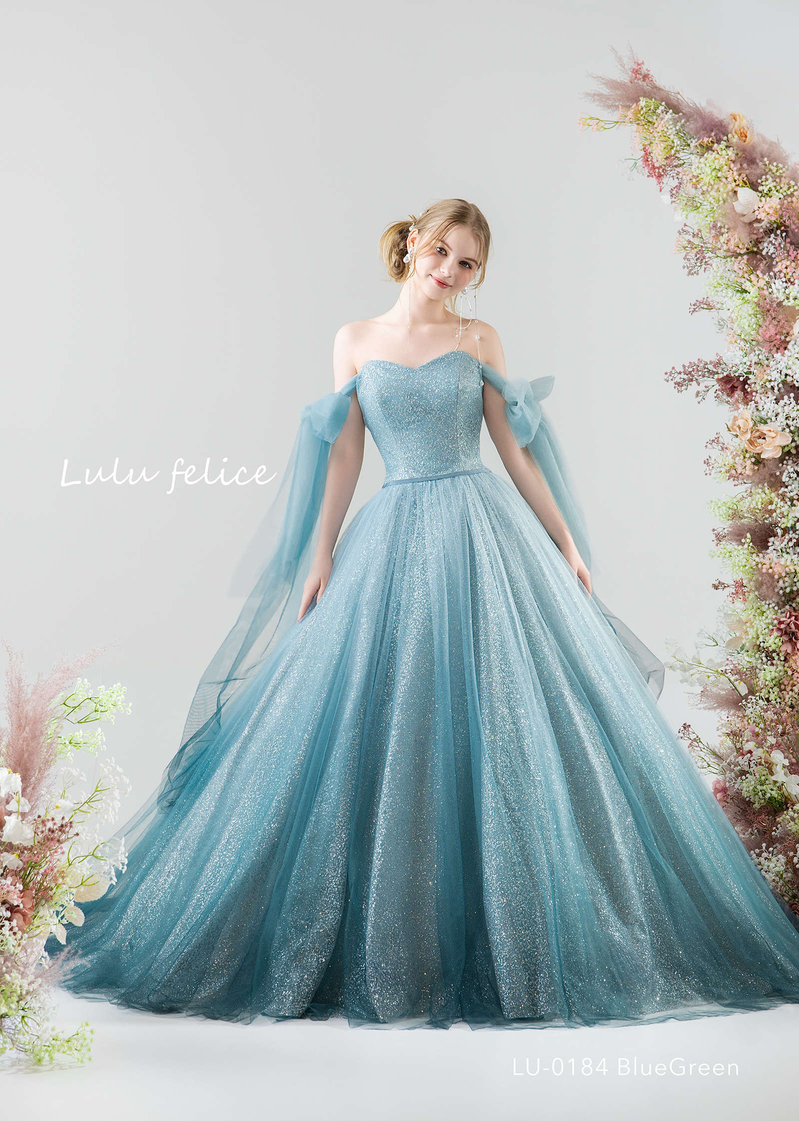 肩リボンは取り外し可能で、スタイリングに合わせたアレンジも自在。可憐さと華やかさを兼ね備えた、印象的なカラードレスです。