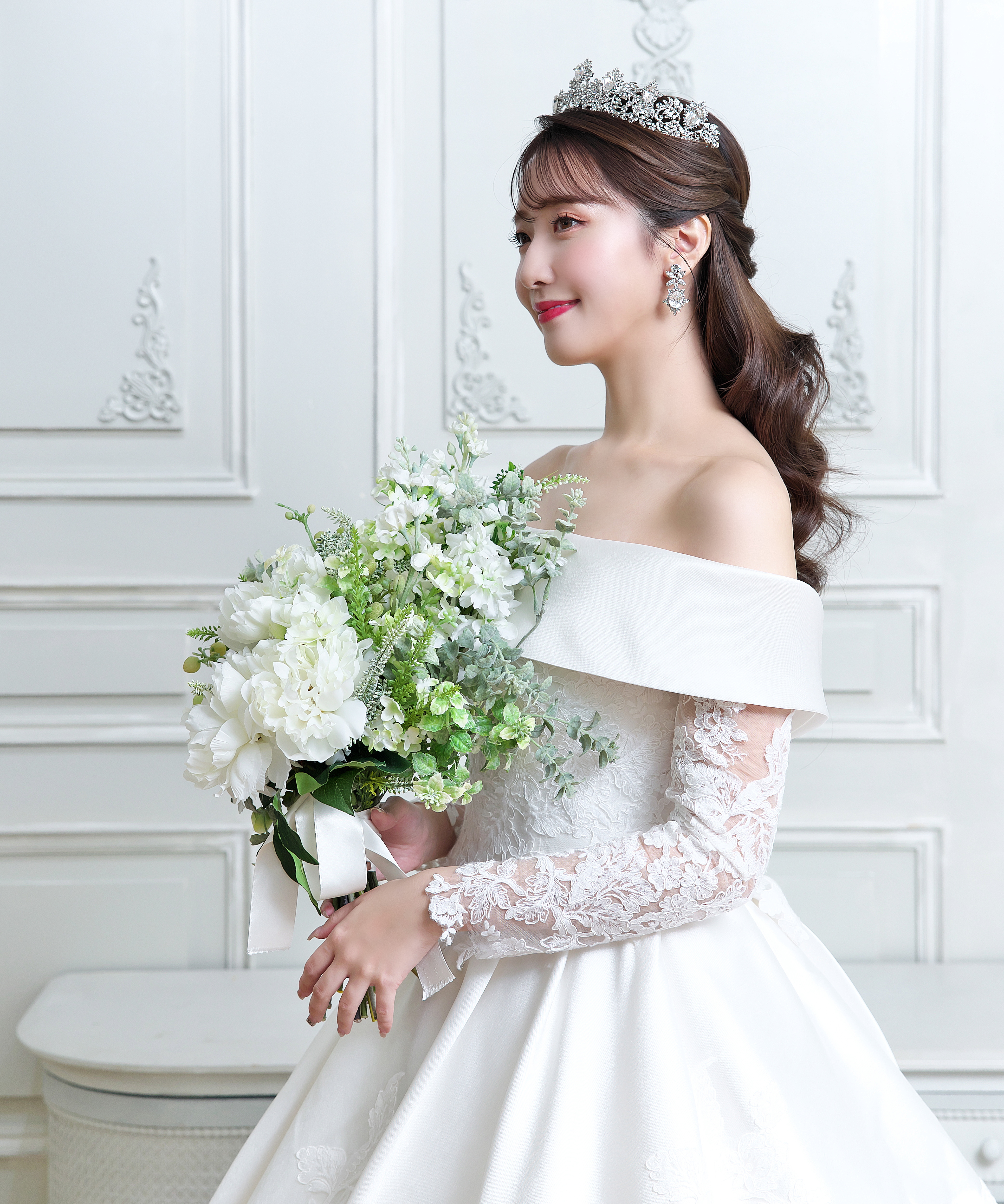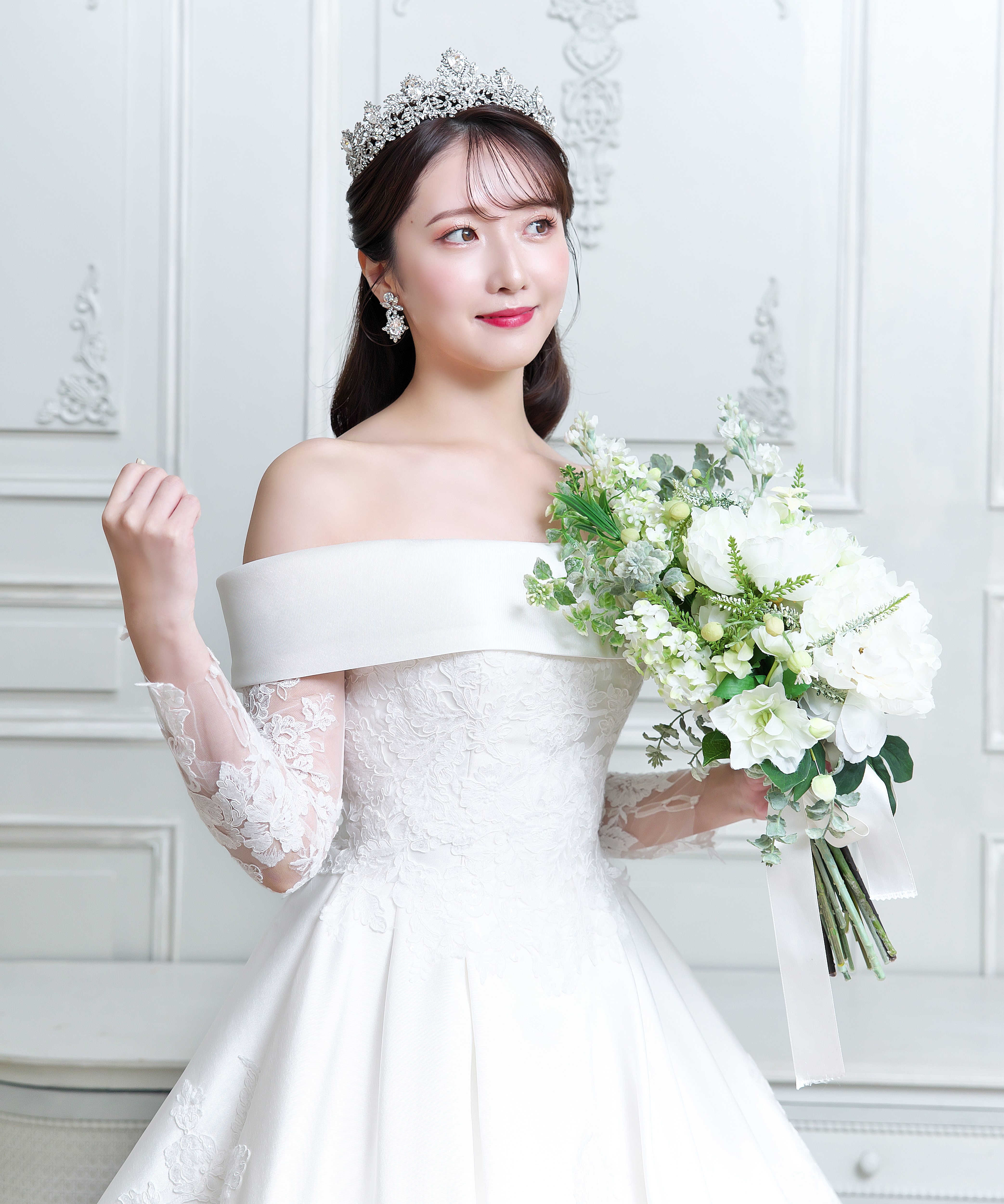 デコルテが美しいケープに長袖を組み合わせました。光沢が美しいミカドに大胆なコードチュールレースを合わせた華やかなAラインのマリエ。ケープ・袖を外してビスチェドレスとしても着こなしていただけます。