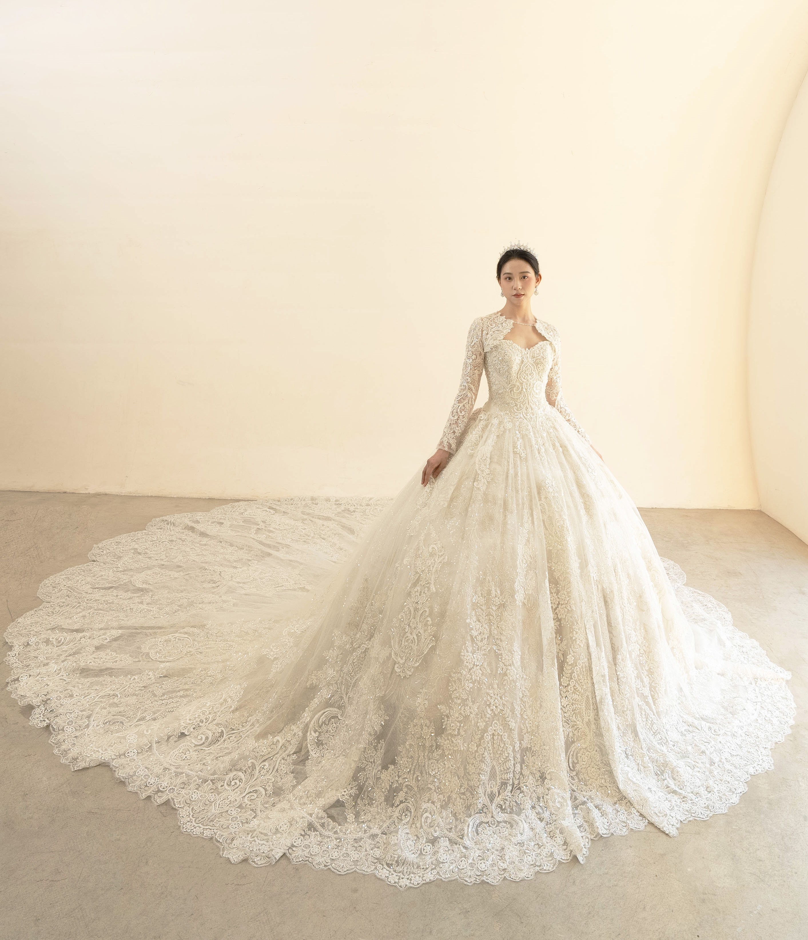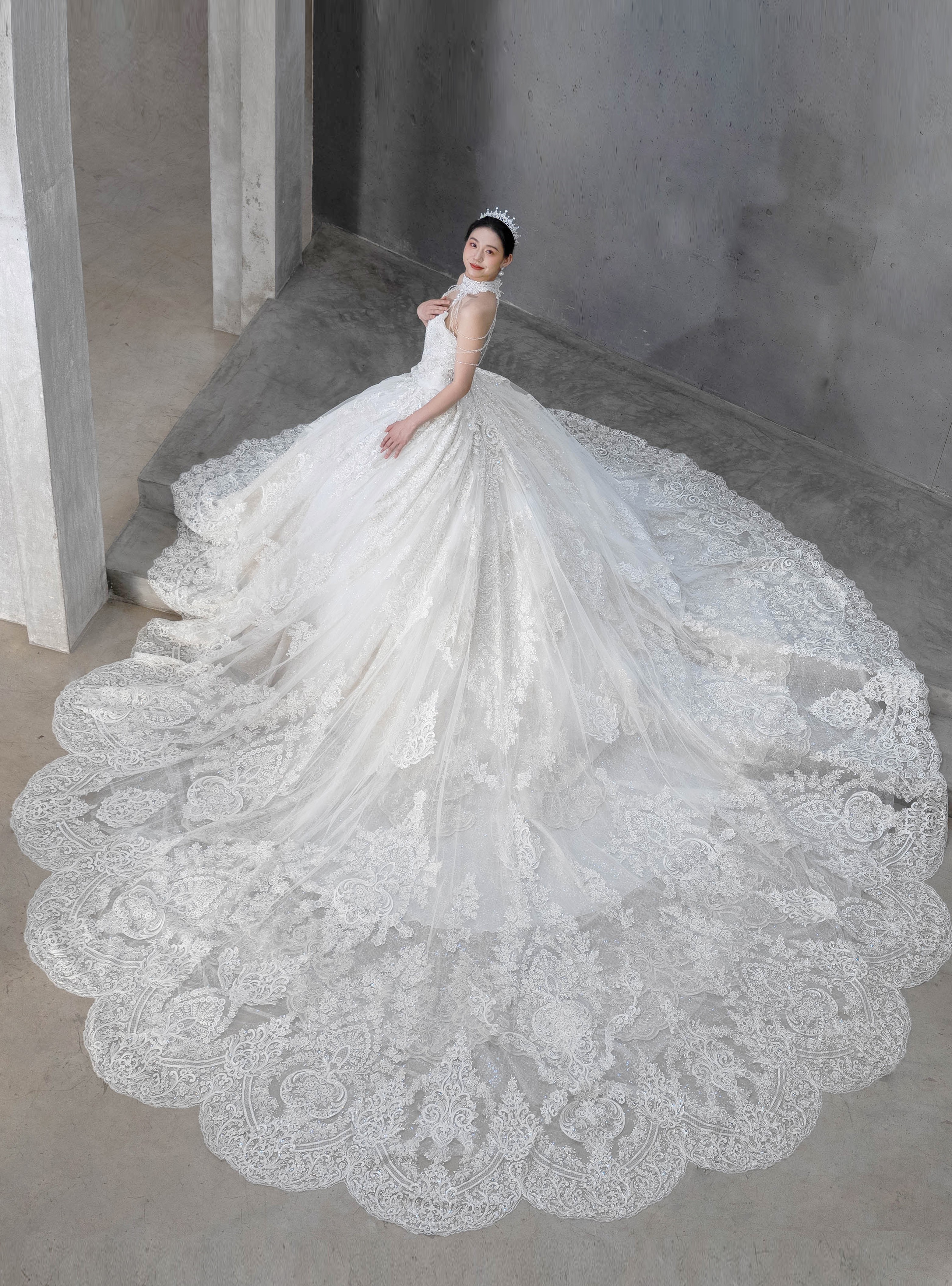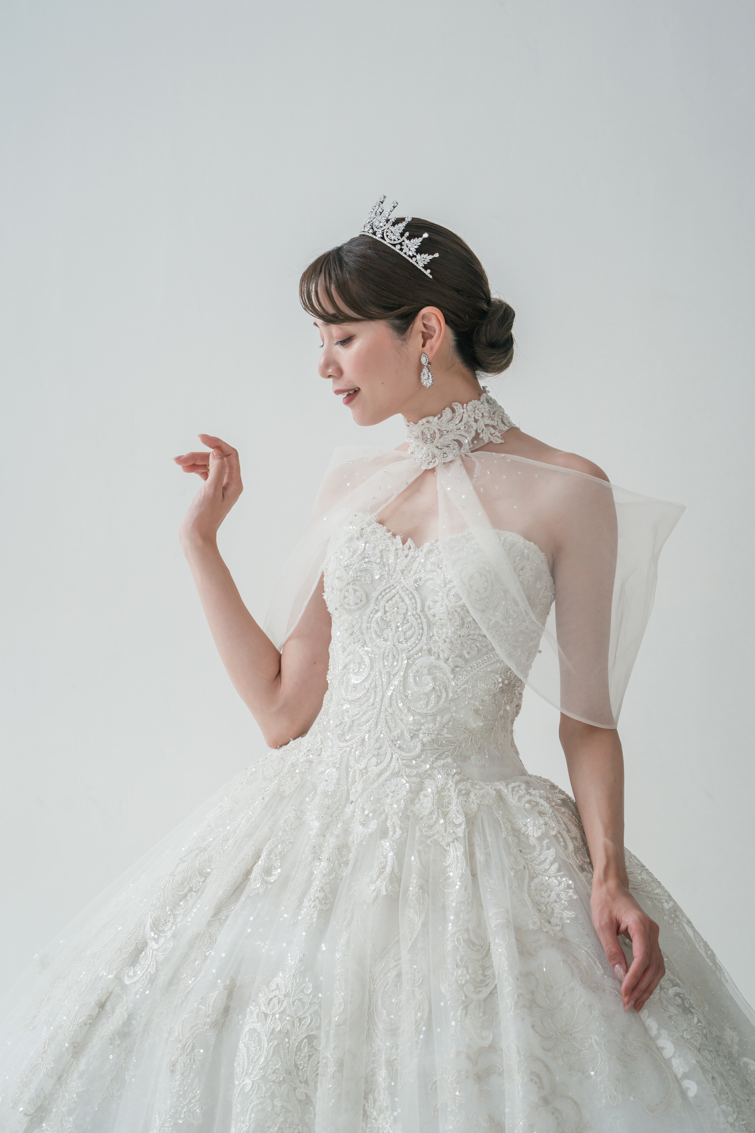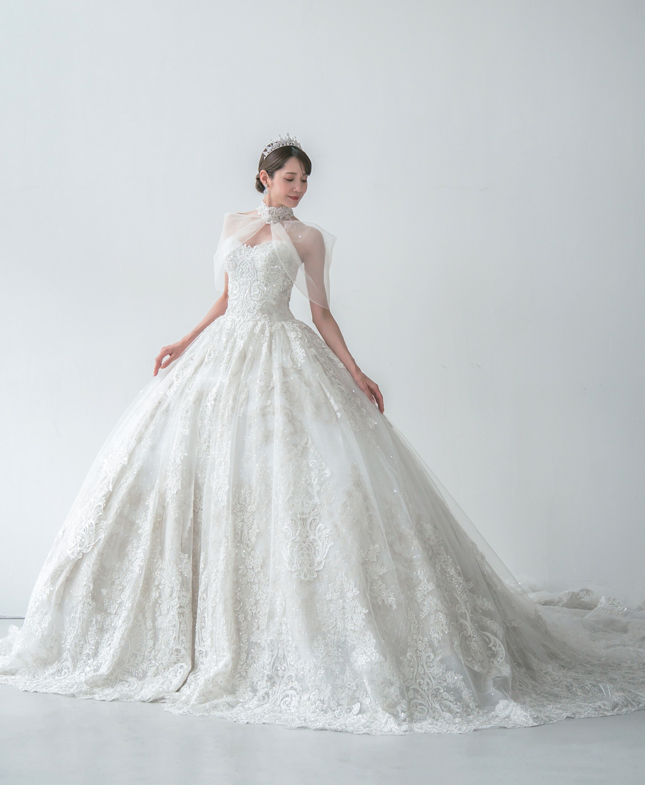 トレーンの長さは圧倒的なロングトレーン、お袖やチョーカーは何通りも変更可