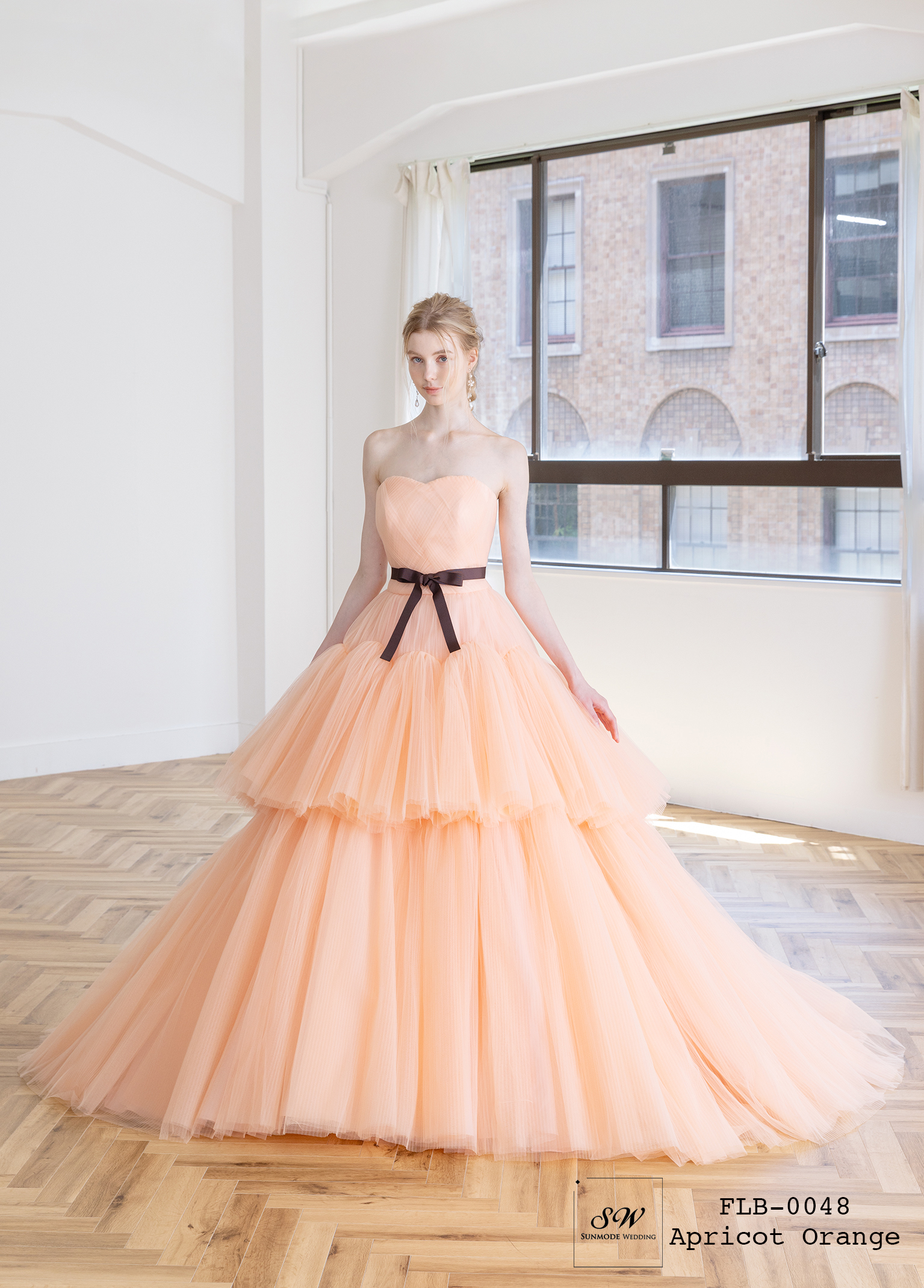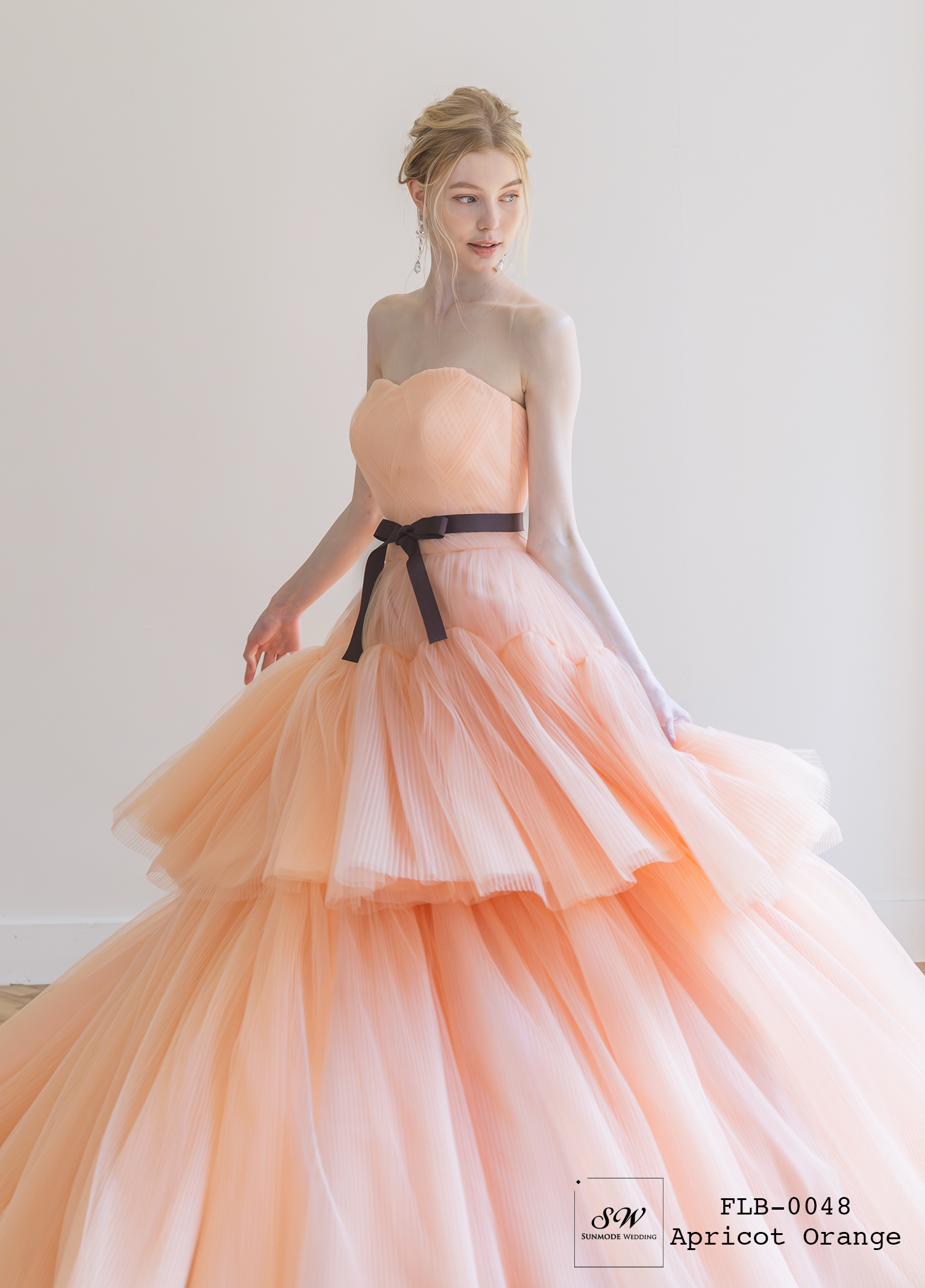 軽やかに重なるチュールが、ふんわりとしたボリューム感を生み出す一着。やさしいアプリコットオレンジの色味が、明るく華やかな印象を演出します。