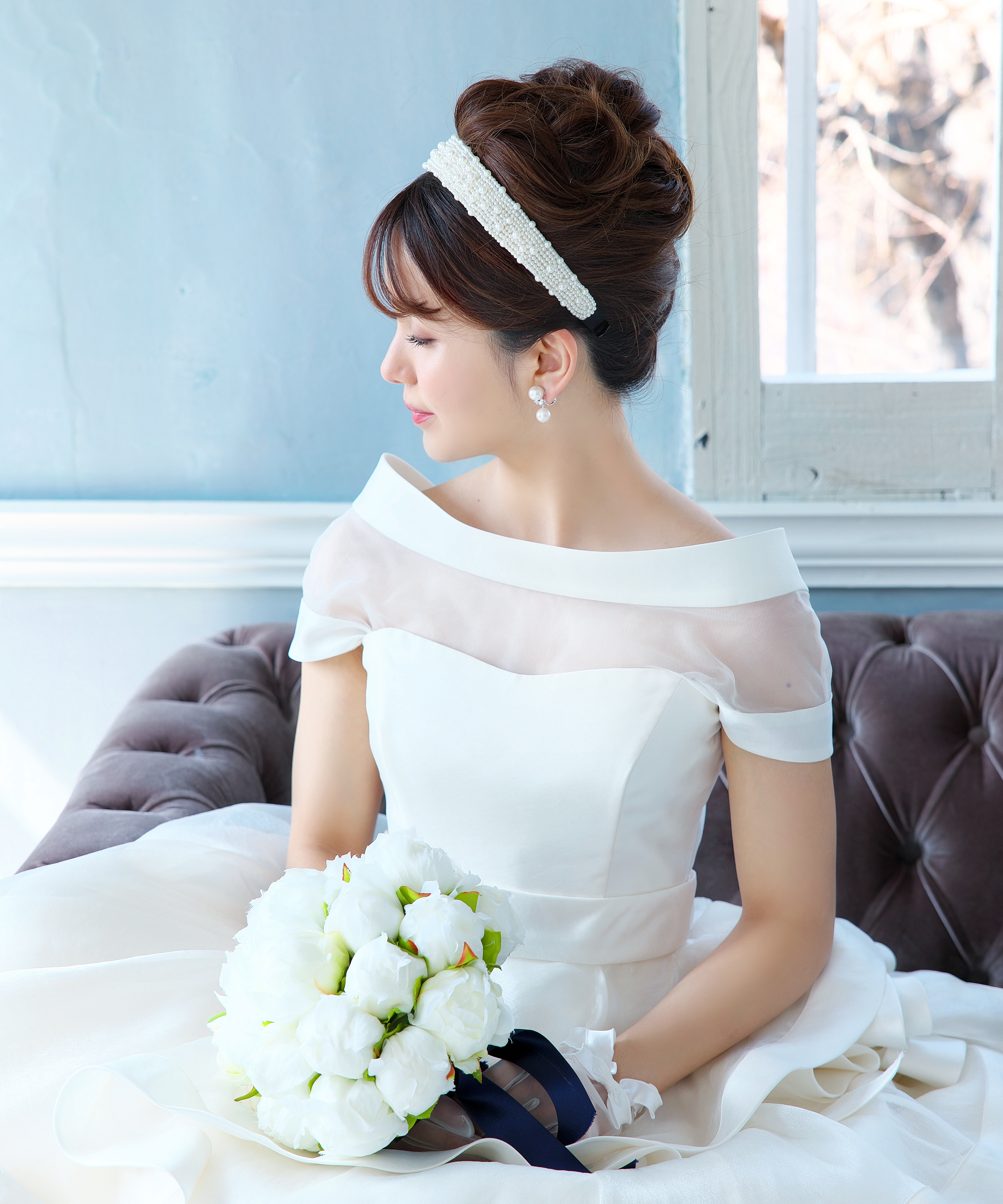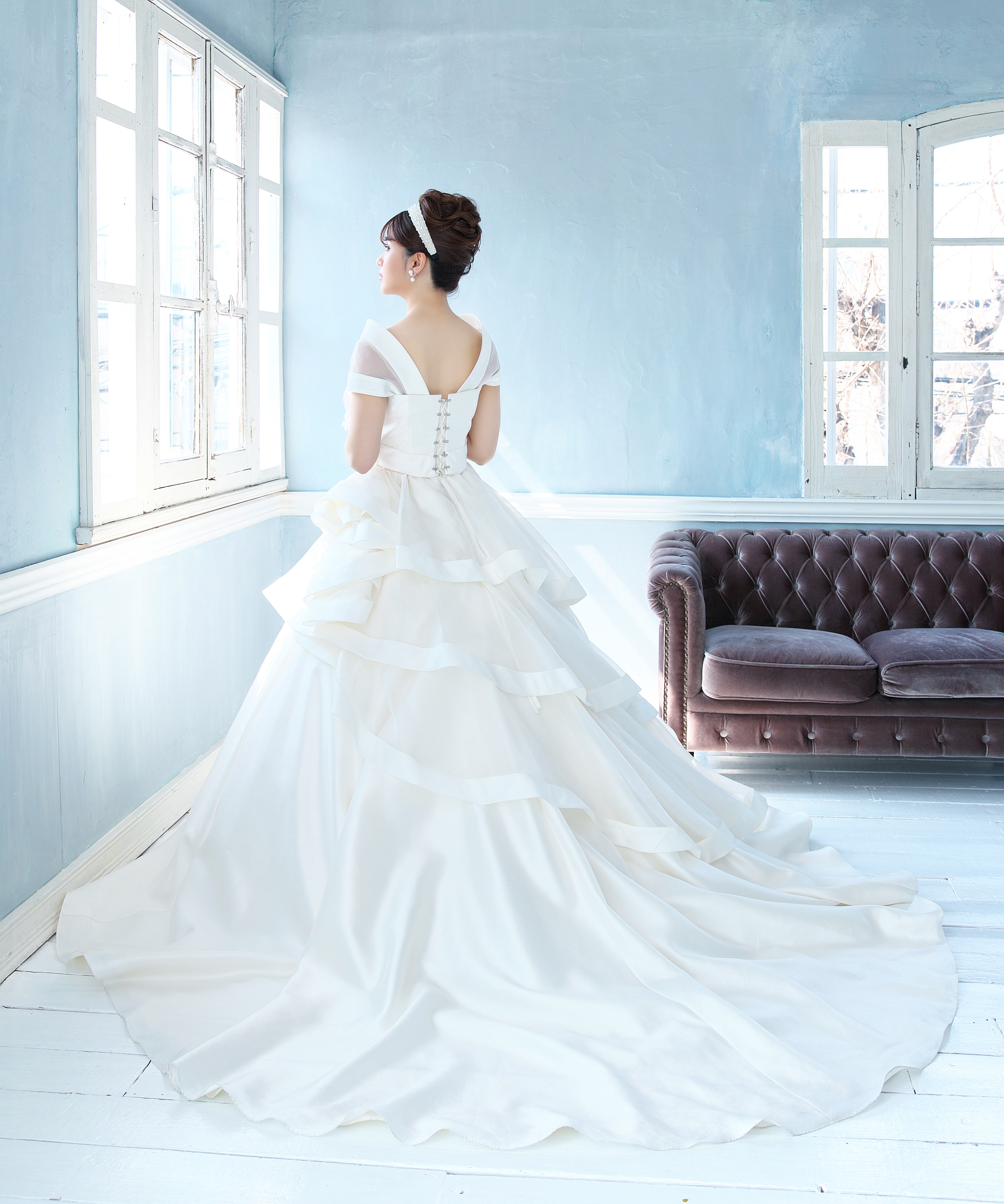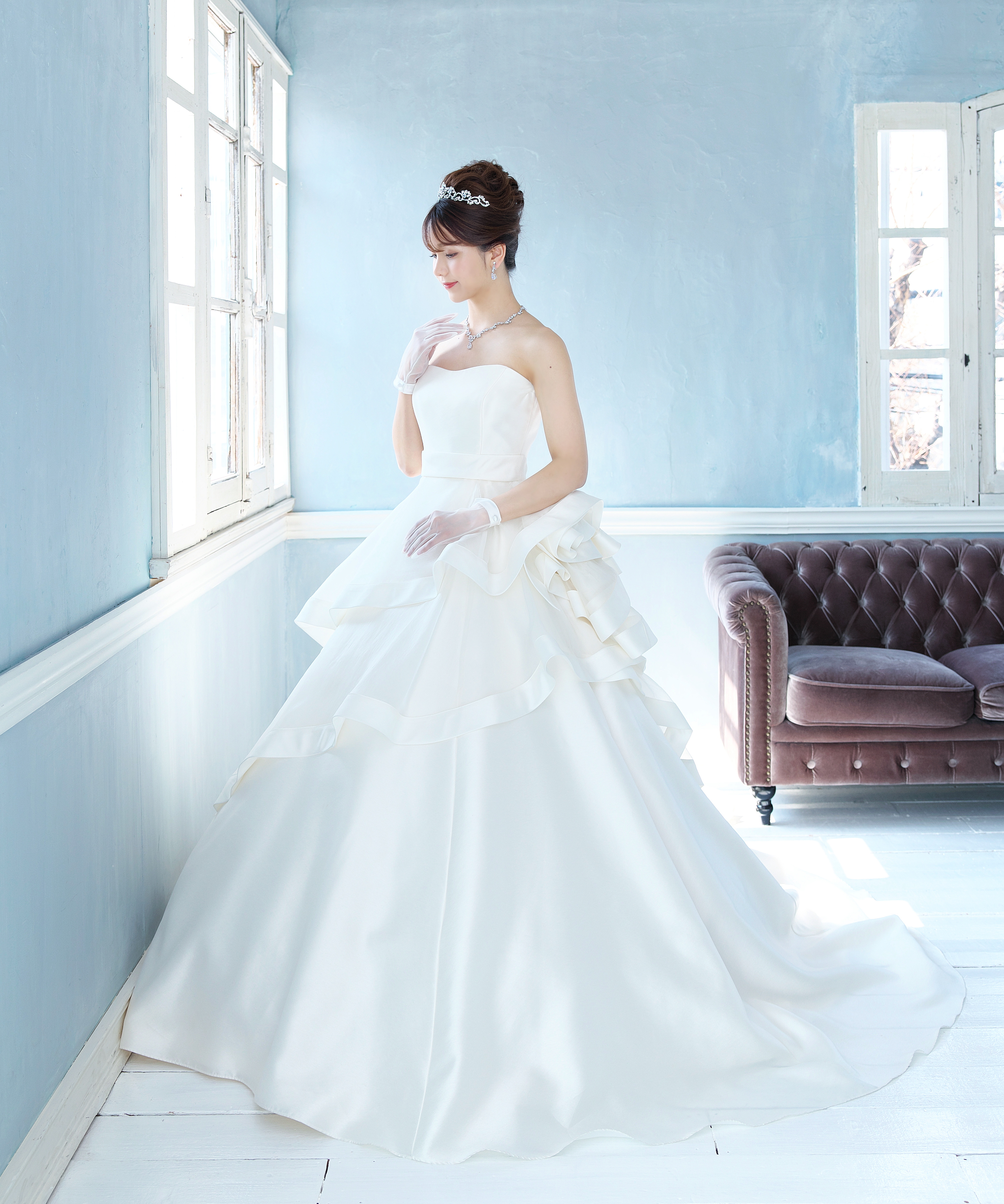 斬新的なデザインでひときわ目を引く花嫁に。 シンプルだからこそ、ドレスのデザインがとても強調されます。 トップスはビスチェタイプにも替えることも♪